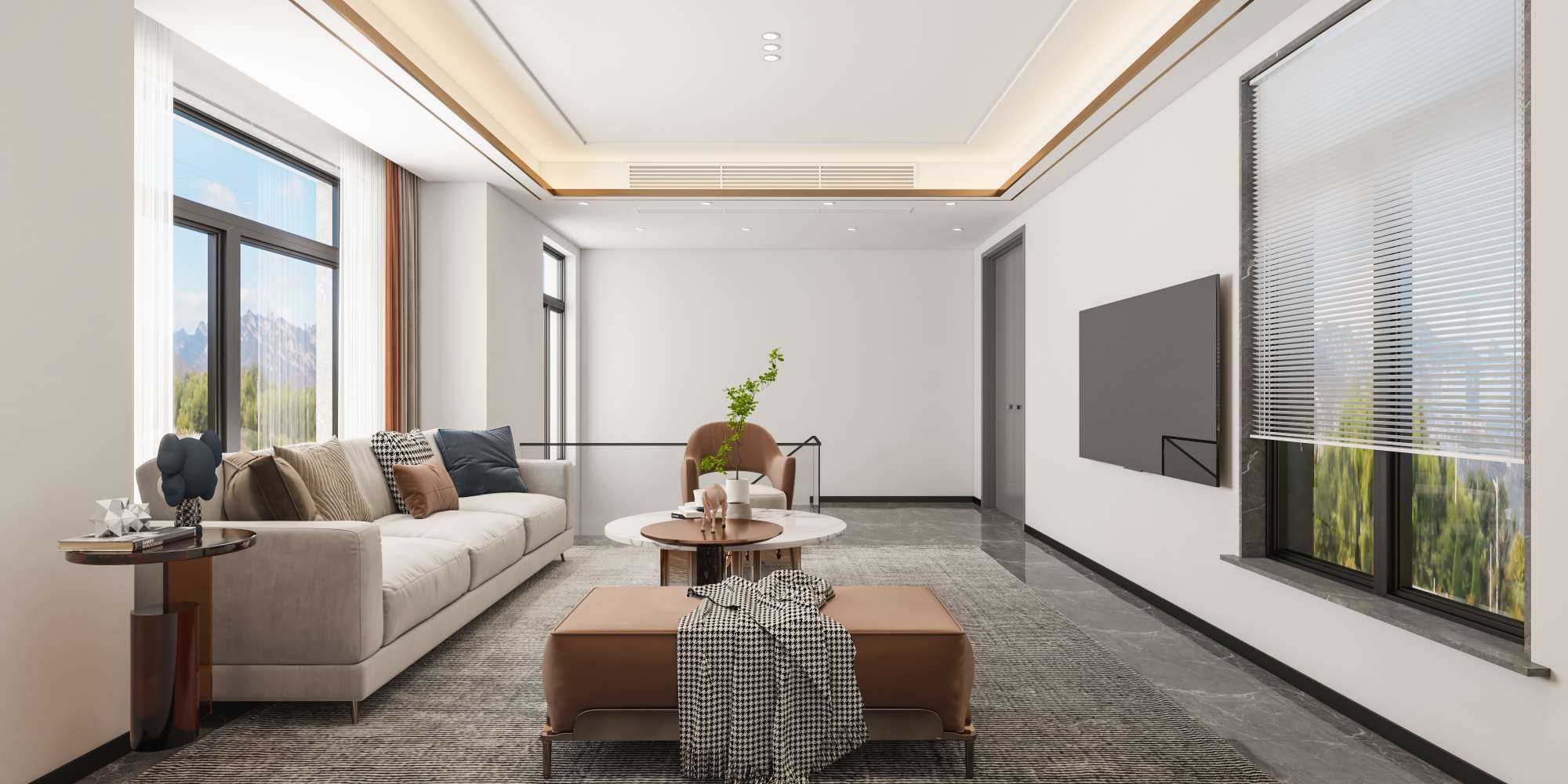 米色沙发搭配棕色系软装,地毯纹理丰富层次。无主灯设计结合金属线条,电视墙简洁利落,窗外自然景观引入,营造舒适且时尚的休闲社交空间。