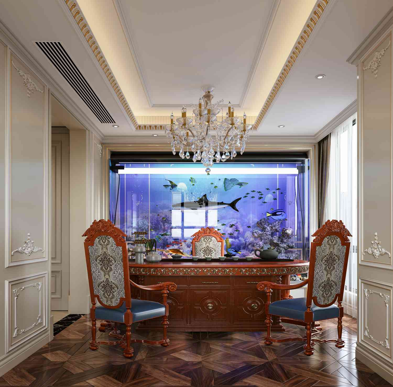 茶室风格典雅,木质家具搭配蓝色软包,色彩和谐。大型生态鱼缸成为视觉焦点,增添自然灵动气息。水晶吊灯与精致墙面装饰,营造出静谧优雅氛围,是主人品茗会友、放松身心的理想场所。