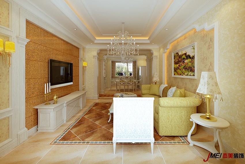 这款甘井子区的第五郡简欧装修风格,采用石膏线条衬托,简约石膏板造型和金色壁纸,让整体融为一体,暖暖的色调非常适合一家人小憩!简单的地砖拼花铺设让业主仿佛置身于夕阳西下的田园生活里,暖意十足,橱柜采用简欧造型,欧式的魅力开始展现出来!